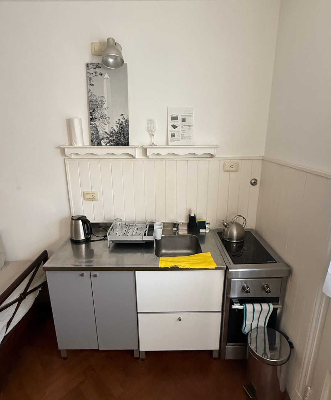 El sector de estar cuenta con un sillón cama, televisor de pantalla plana y una cocina completa, equipada con enseres para hasta cuatro personas, ofreciendo comodidad y practicidad en un espacio integrado.